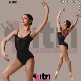 La morbida scollatura a V slancia il collo, mentre la parte centrale è decorata con velluto e tessuto floccato con motivo laser che si fonde con inserti laterali in rete trasparente. Questa composizione snellisce visivamente la silhouette e aggiunge un'eleganza dinamica. La solida base in nylon segue i contorni del corpo, garantendo una vestibilità sicura senza limitare i movimenti. La schiena è caratterizzata da una rete semitrasparente e da un profondo taglio arrotondato che mette in risalto le spalle ed esalta l'eleganza della postura.